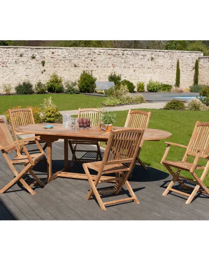Set 1 ovale tafel + 4 stoelen + 2 Lombock teakhouten fauteuils - 180/240x100x75 cm