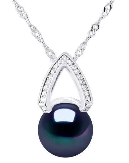 Zilveren booghalsband, zirkonia en zoetwaterparel met zwarte knoop