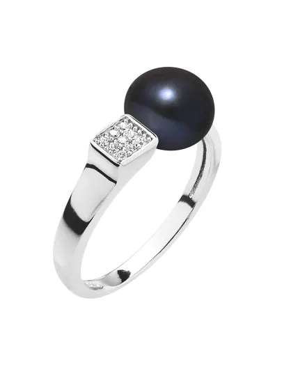 Vierkante verstelbare ring in gerhodineerd zilver, zirkonia en zoetwaterparel, zwarte tahiti-knop