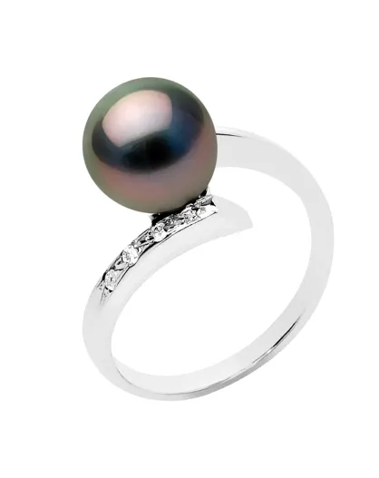 Witgouden sieradenring, 0.04 ct diamanten en ronde Tahitiaanse parel