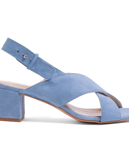 Clara blauwe fluwelen leren sandalen met hak van 5,5 cm