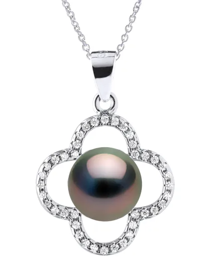 Halsketting met zilveren klaver, zirkonia en Tahitiaanse parels