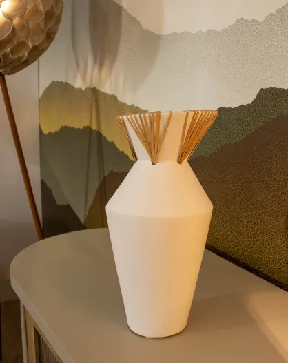 Witte Aya vaas van hars en rotan - D.18x37 cm