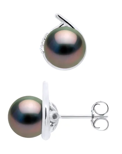 Witgouden oorbellen, diamanten van 0,06 ct en ronde zwarte Tahitiaanse gekweekte parels