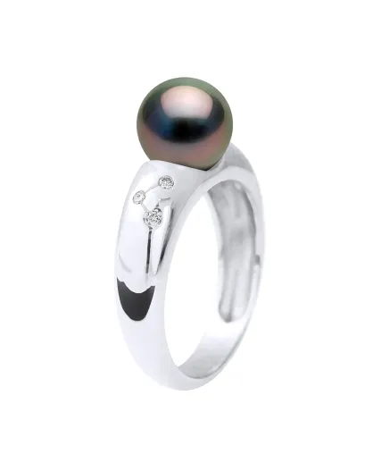 Witgouden gebogen armbandring, diamanten van 0,06 ct en zwarte ronde Tahitiaanse gekweekte parel
