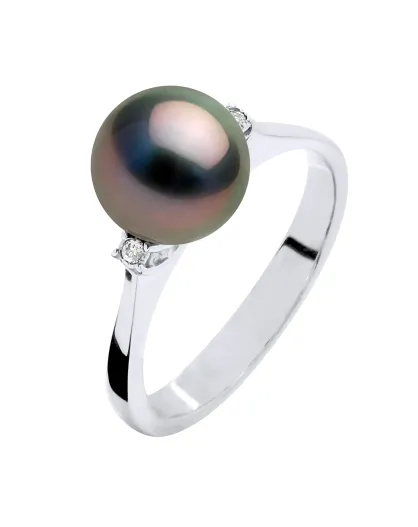 Witgouden ring, diamanten van 0,06 ct en zwarte ronde Tahitiaanse gekweekte parels