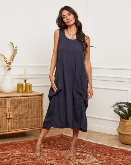 Marineblauwe jurk van 100% linnen Alteo