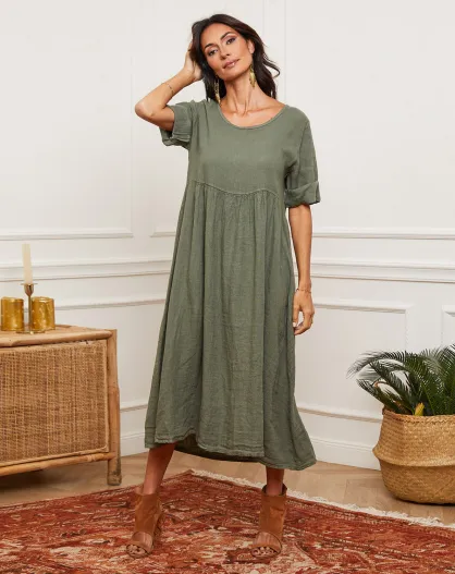 Kaki jurk van 100% linnen Gustaro