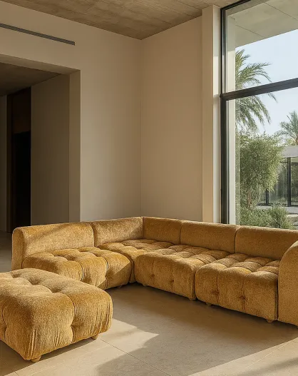 Twiggy oranje hoekbank van gepaneerd fluweel met 5 modules - 300x265xH.67 cm