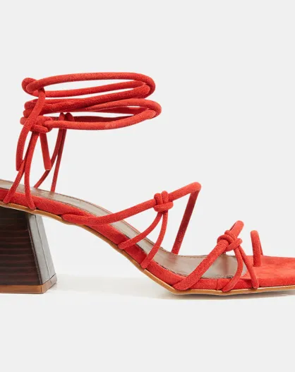 Oranjerode Goldie lederen fluwelen sandalen met hak van 7 cm