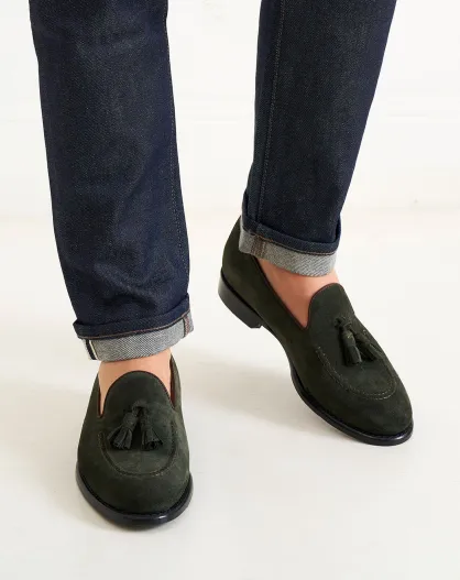 Groene leren instappers van fluweel met kwastjes