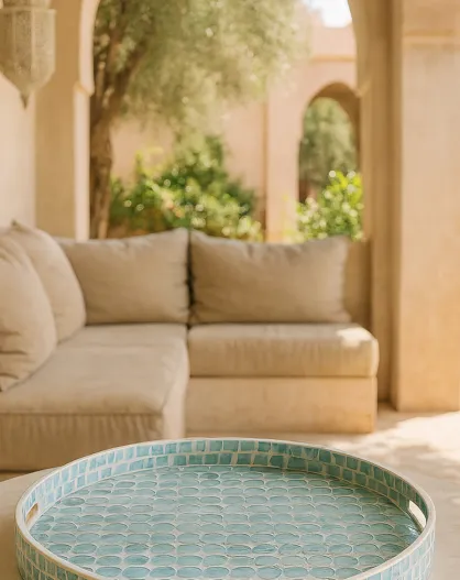 Rond dienblad met blauwe solna parelmoer schelpgreep - D.45x6 cm