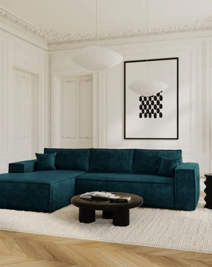 Linkerhoekbank converteerbaar expressmatras 140 cm RUBY fluweel pauwblauw fluweel - 320x165x80