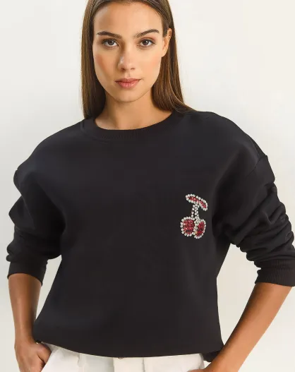 Trui met ronde hals versierd met zwarte kersenstenen
