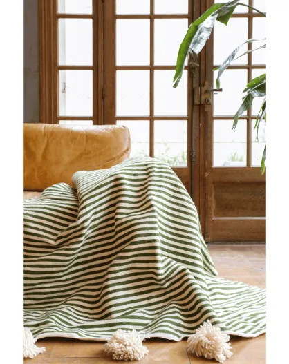 Berber plaid met witte kwastjes en kaki strepen - 300x200cm