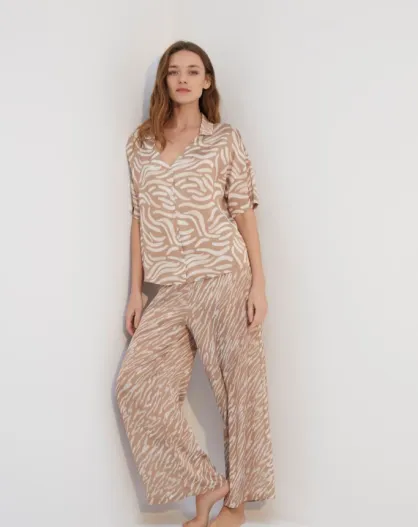 BJM-1710 Koffiesatijnen pyjamaset met overhemdkraag