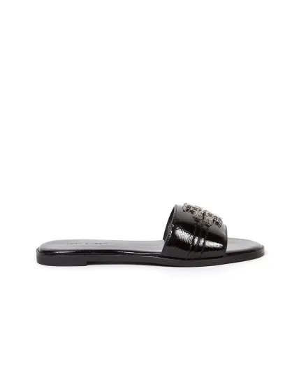 Everly Slide platte sandalen van leer, zwart/kristal/zilver