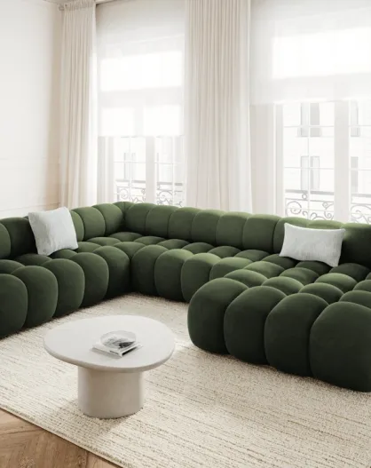 Modulaire panoramische hoekbank Maurice vert velvet links - 335x245x70 cm