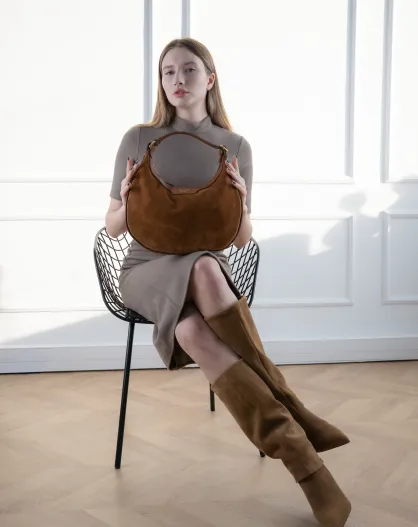 Siana Camel Velvet leren schoudertas - 33x27x6 cm
