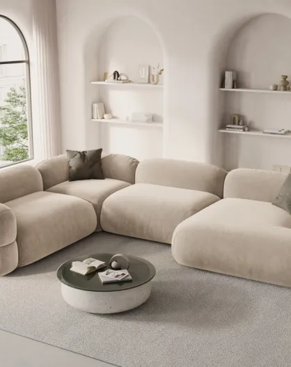 Lony Velvet Modulaire panoramische hoekbank, rechts, 5-zits, lichtbeige, 345x250x68 cm