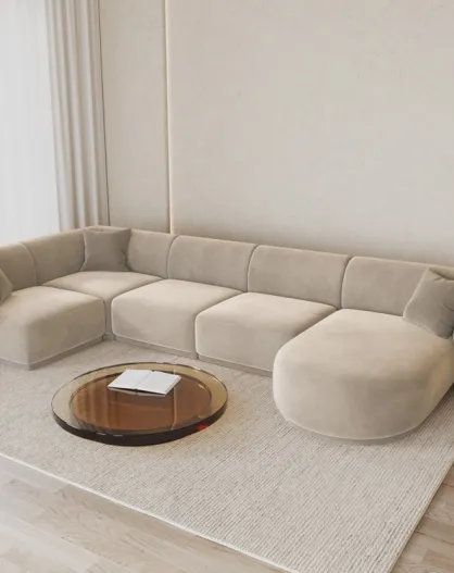 Panoramische hoekbank (rechterzijde) geel fluweel 6-zits beige - 336x166x74 cm