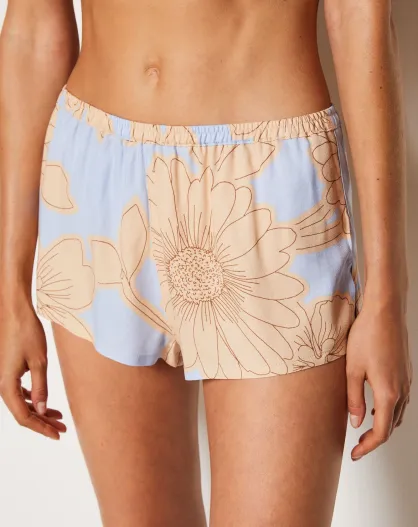 Magnolia-short met paarse achtergrondprint