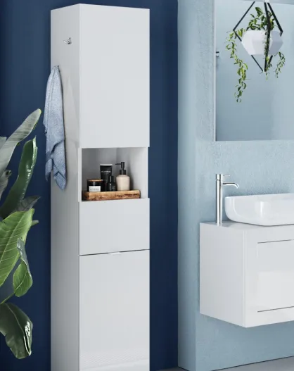 Bari - Draaibare opbergkolom voor de badkamer 2 deuren +1 nis Wit glanzend gelakt met spiegel 1 lade 2 deuren - 35x180x35 cm