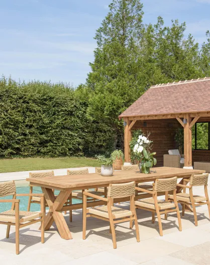Tuinmeubelset voor 8/10 personen - 1 rechthoekige eettafel en 8 beige tuinstoelen met ruitpatroon