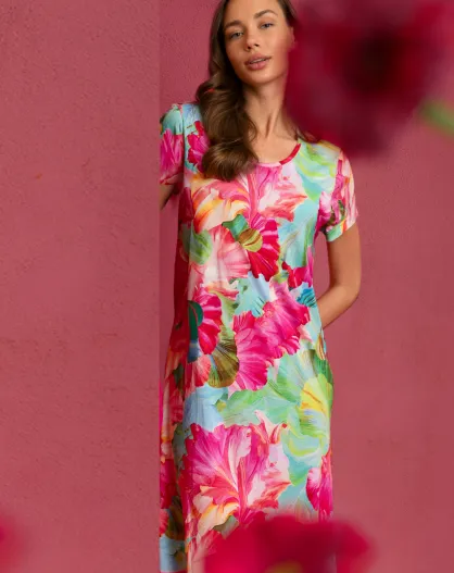 Jurk met korte mouwen en felgekleurde fuchsia bloemen