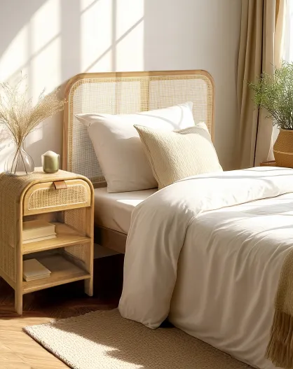 Nachtkastje met ronde vorm, mindi en natuurlijk rotan, 1 lade, 2 planken - 42x35x65 cm