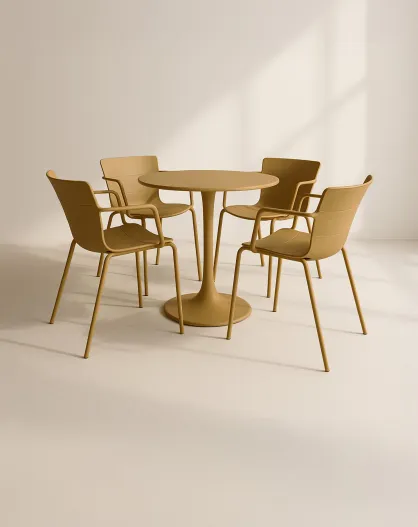 Montauk okerkleurige tafelset/4 fauteuils in polypropyleen en metaal