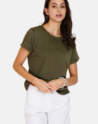 Francine T-shirt met ronde hals en lichte kaki linnenmix