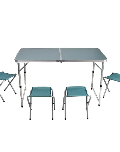 Opvouwbare campingtafel met 4 blauwgrijze aluminium krukken - 120x60x70 cm