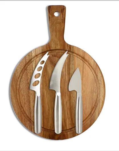 Ronde snijplank van acacia met 3 roestvrijstalen kaasmessen naturel - 24cm