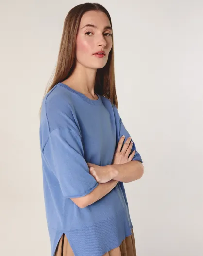 Oceaanblauwe trui van Sakura-wol met korte mouwen en ronde hals