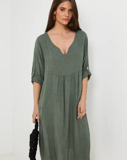 Kaki jurk van 100% linnen Léana