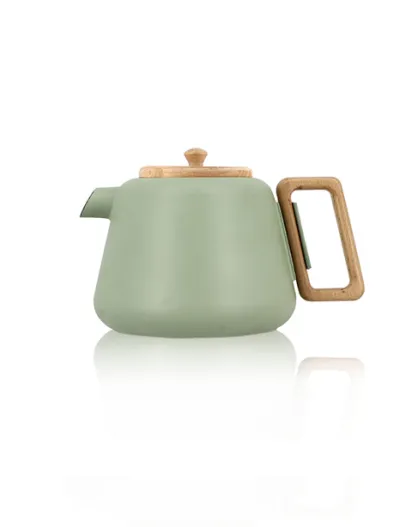 Viggo amandelgroene gietijzeren theepot met handvat, houten deksel - 50cl