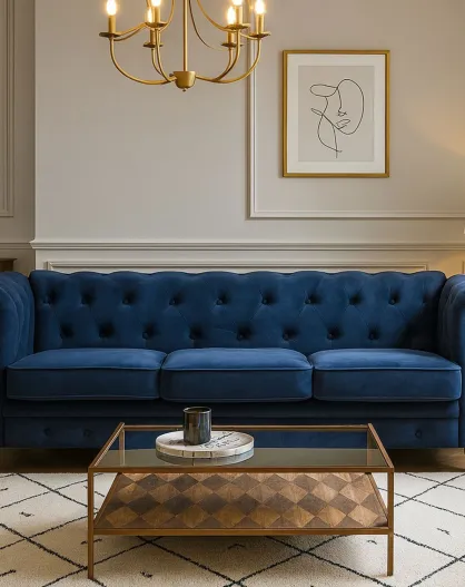 Grote 3-zitsbank in blauw Chesterfield-fluweel - 209x82x72 cm