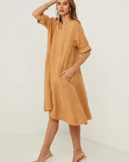 Galinia kameelkleurige linnen jurk