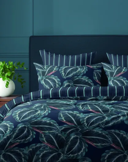 Calathea donkerblauw dekbedovertrek van katoensatijn + kussensloop - 240x220 cm + 2x (63x63 cm)