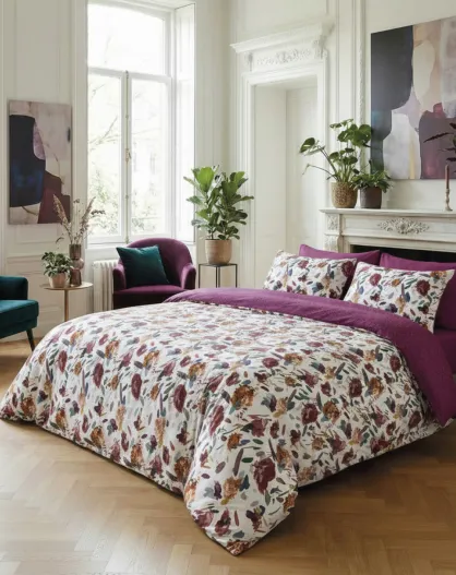Arty flowers dekbedovertrek van wit katoensatijn + kussensloop - 140x200 cm + 63x63 cm
